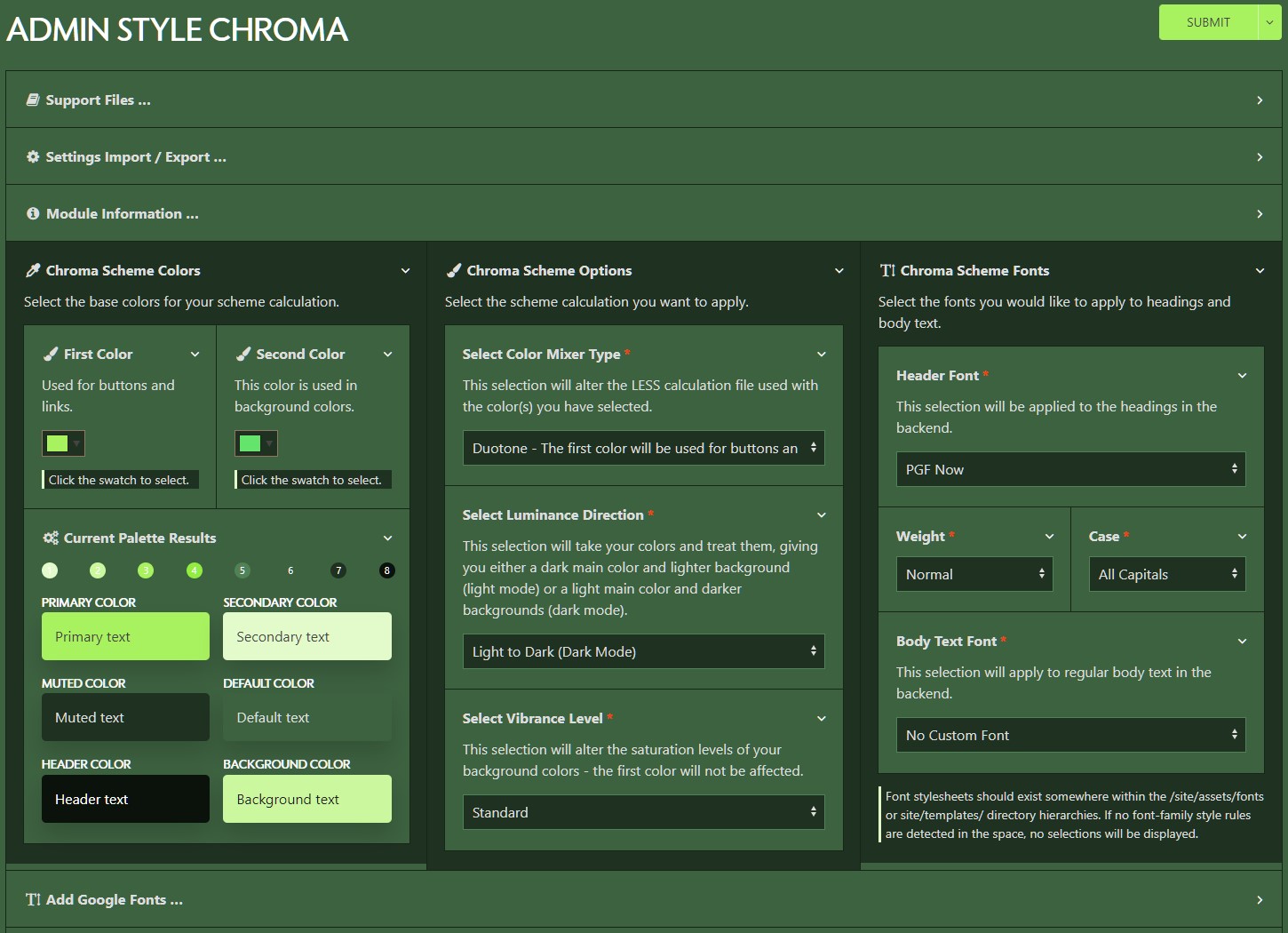 Using the color selectors, you can select the first color - your main color - and a second color if you wish - your accent color. Only the first color is required. The default color scheme installed by the module is a grayscale dark mode theme.